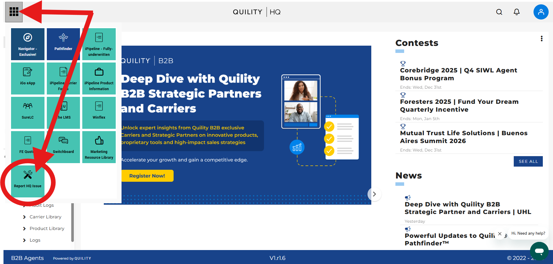 You are able to view your agency hierarchy to ensure all downline agents are present in HQ (screenshots provided at end of this article). If any agents are missing or if your agency's upline/downline information needs to be updated, you can submit a JotForm through HQ's top left corner 9-box grid, 'Report HQ Issue', and mark 'HQ Hierarchy Concern' with the necessary agency update details.