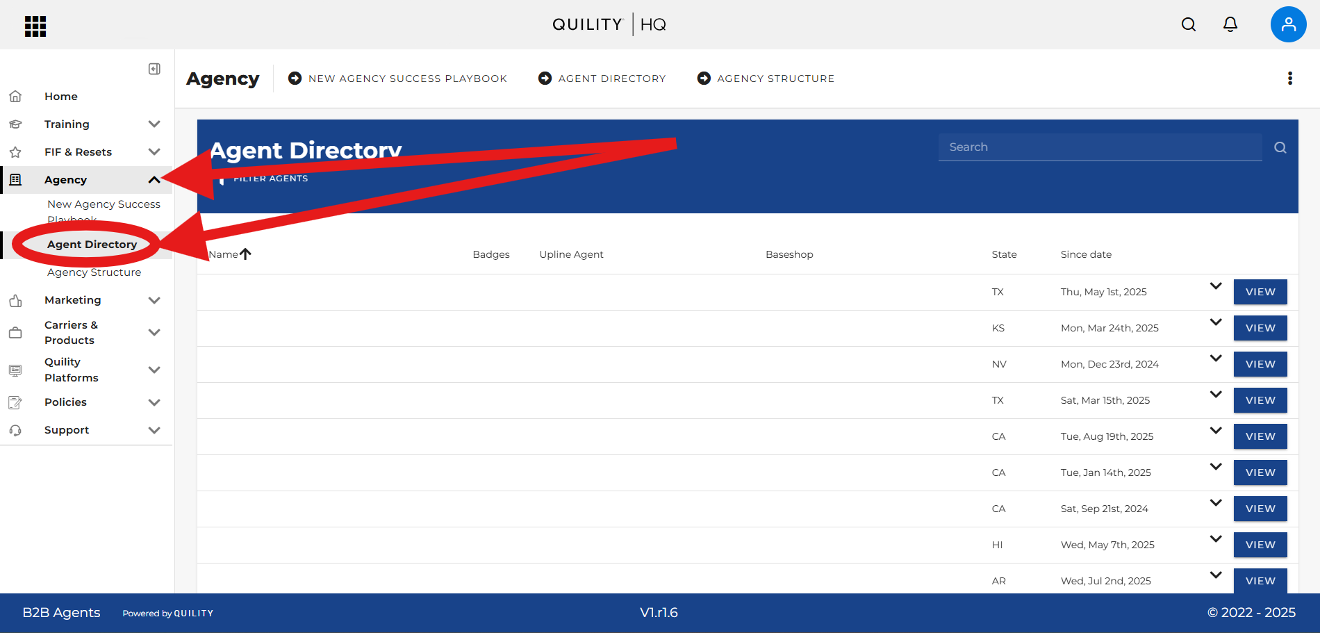 To view all your agents, click 'Agency' on the left tab, then select "Agent Directory" as shown in the attachment below. You can add filters to view specific agents, if needed.