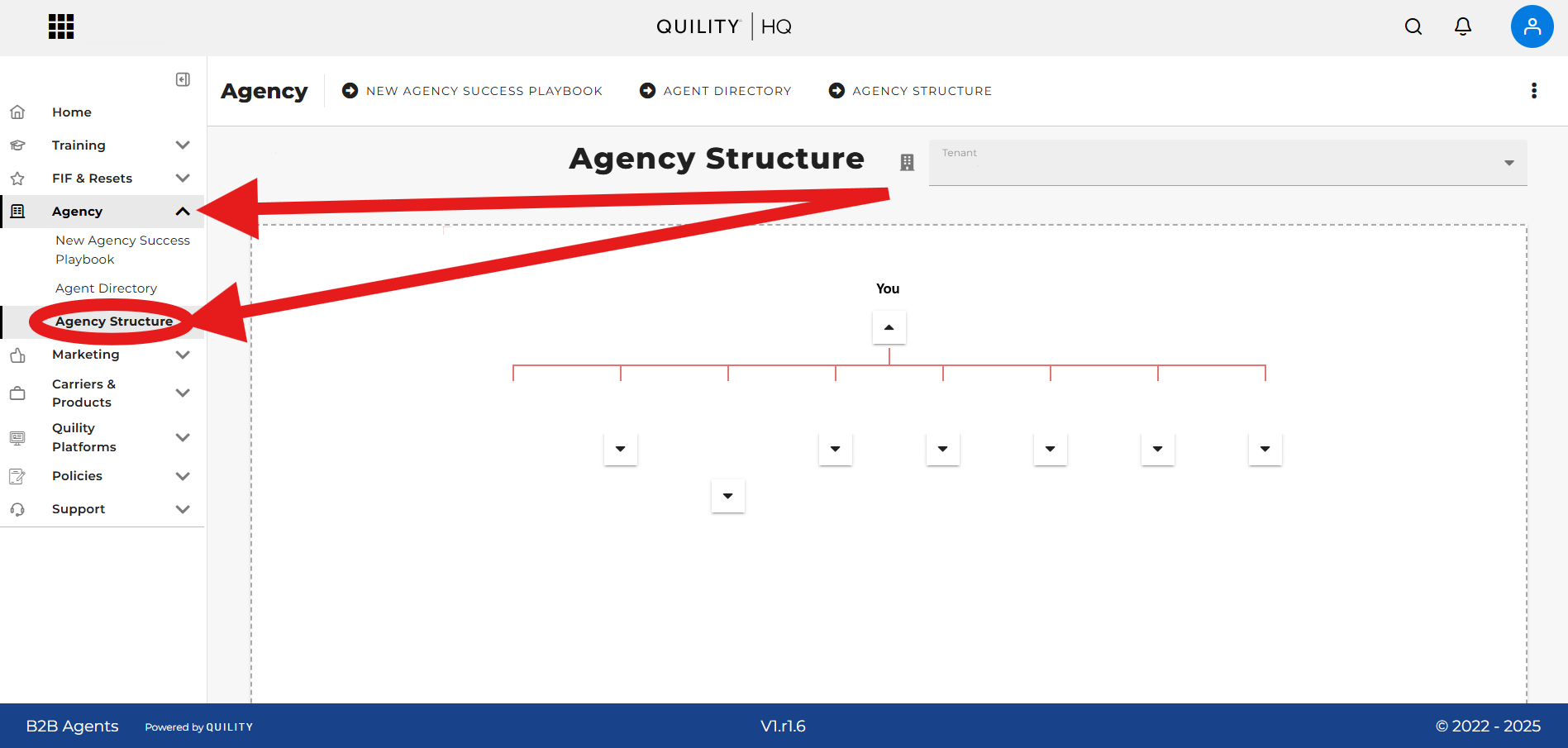 Additionally, under the 'Agency' tab, below the "Agent Directory," there is an 'Agency Structure' that allows you to view the tree of downlines connected to your agency.