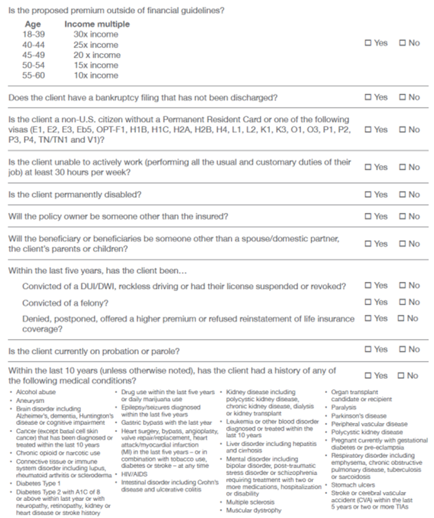 Use the Quantum Pre-screen Brochure to eliminate ineligible clients. We also strongly recommend submitting details to underwriting at RiskAssessment@fglife.com. |