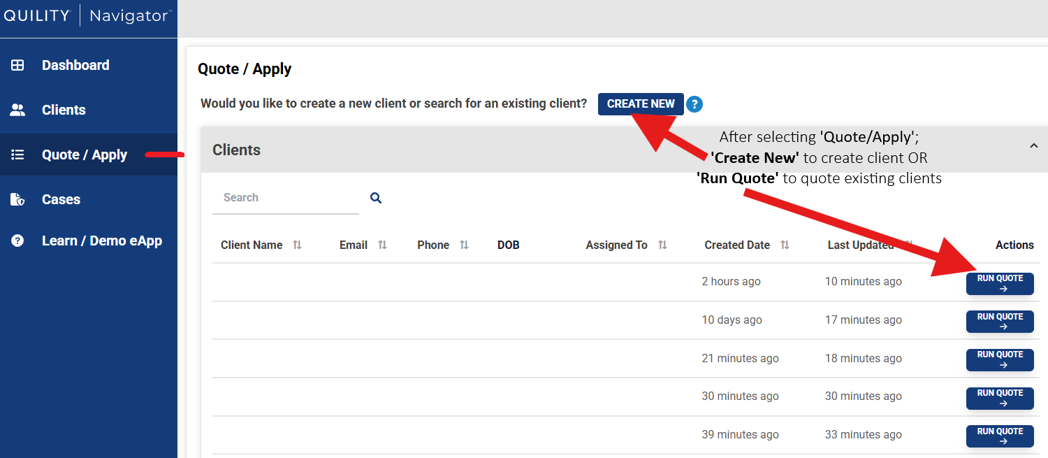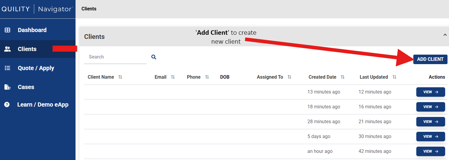 Once you have access to Navigator (refer to the 'Use Navigator' article for guidance), you can create a client to start quoting. To do this, click the 'Clients' tab on the left taskbar. This allows you to create a new client in Navigator and enter the relevant client information. Alternatively, you can select 'Quote/Apply', then click 'Quote/Apply' again to add a new client. You are not able to import leads to Navigator, but you can easily create new clients for quoting.