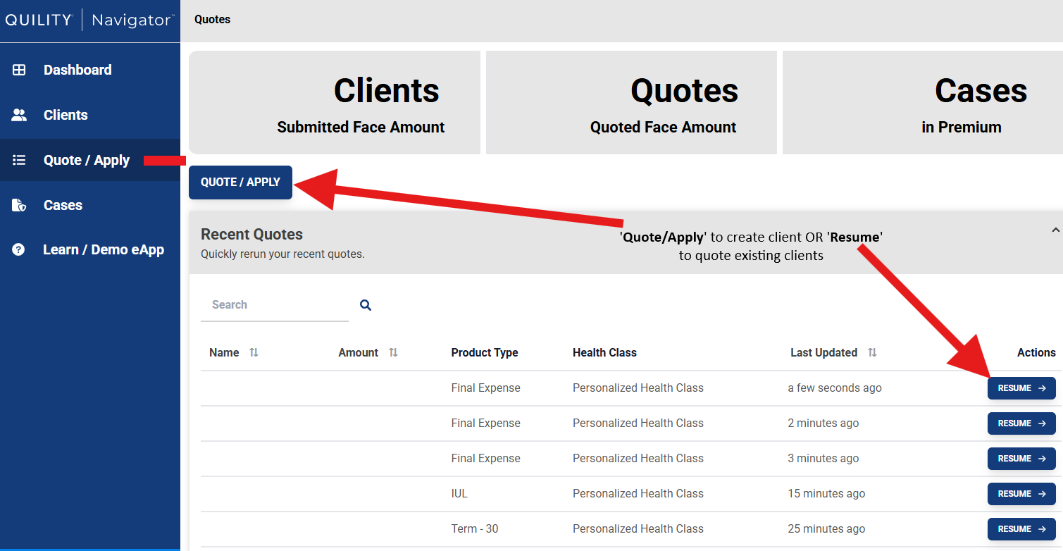 The 'Quote/Apply' tab on the left taskbar is how to start a quote for any client. It will display all your clients in Navigator and you can select 'Resume' to start a quote for a new or existing client. You can view the screenshots below for a visual guide.